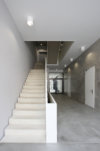 Son organisation en plan est articulée autour d’une concentration des circulations verticales et des distributions dans une bande étroite adossée sur le pignon de l’immeuble mitoyen. L’organisation des éléments constitutifs du hall, le contraste des matériaux employés et des textures sélectionnées ainsi que la prise de lumière naturelle aménagée en partie haute définissent et affirment le caractère ouvert de cette interface qui ordonne une distribution directe et claire vers les différents composants du programme : salle multifonctionnelle au rez-de-chaussée, bureaux et salles de réunion aux étages.